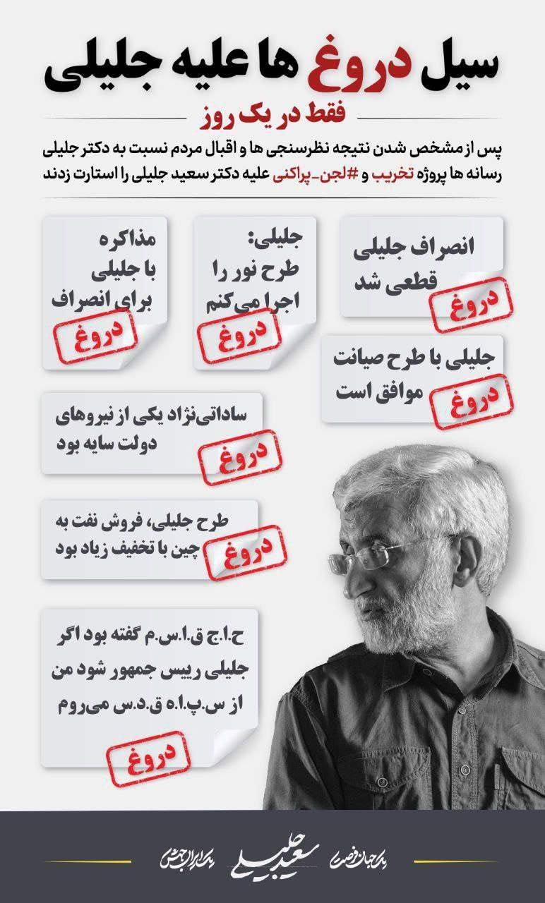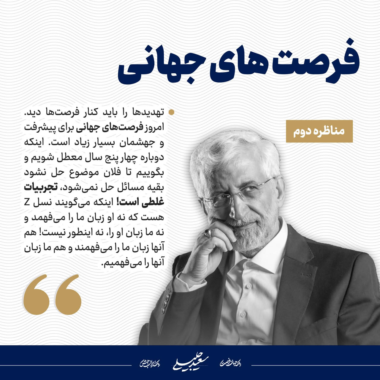 🔻یکی از دلایلی که خیلیها میگویند جلیلی کارنامه ندارد، به همین دلیل است که خوشبختانه یا متاسفانه، ایشان اهل ارائه و اشاره به «کارهایی که انجام داده» نیست و تمرکز خودش و ستادش را میگذارد روی «کارهایی که میخواهد انجام دهد».