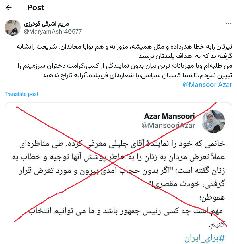 🔴 سرکار خانم منصوری، تیرتان را به خطا هدر دادهاید و مثل همیشه، هم نوا با اپوزیسیون و معاندان، اسلام و شریعت را نشانه گرفتهاید که به اهداف پلیدتان برسید.