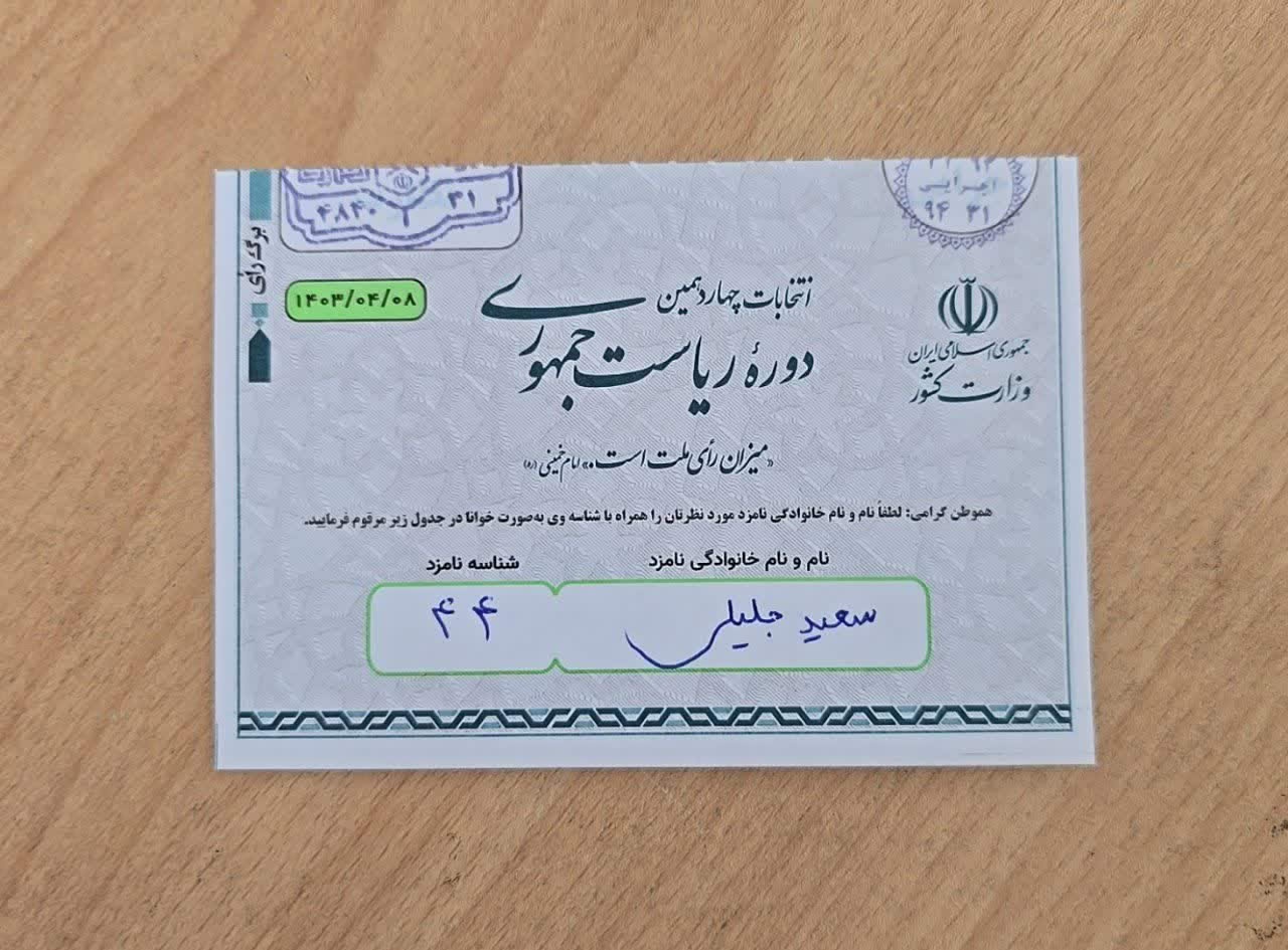 نکته : برگه ای بزرگ در همه محل های رای گیری نصب میشه … برگه آ4 که کد سعید جلیلی روی آن نوشته شده است … سعید جلیلی 44 – کد سعید جلیلی را با خط مناسب روبروی اسم در کادر مشخص شده بنویسید …