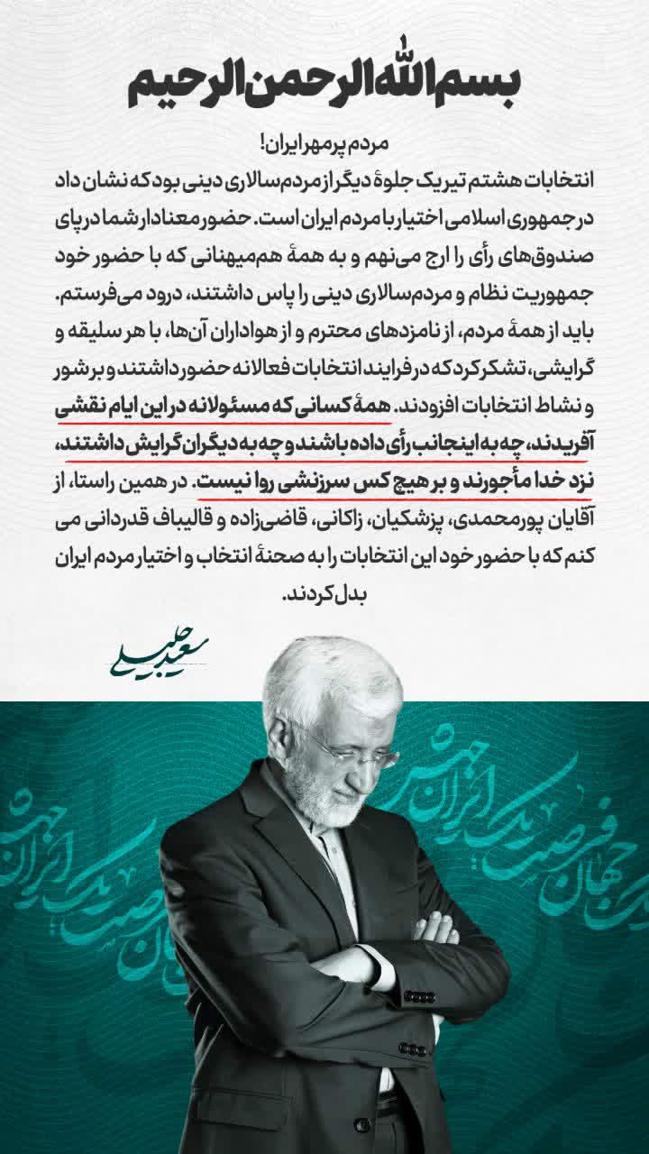 همۀ کسانی که مسئولانه در این ایام نقشی آفریدند، چه به اینجانب رأی داده باشند و چه به دیگران گرایش داشتند، نزد خدا مأجورند و بر هیچ کس سرزنشی روا نیست. در همین راستا، از آقایان پورمحمدی، پزشکیان، زاکانی، قاضیزاده و قالیباف قدردانی میکنم که با حضور خود این انتخابات را به صحنۀ انتخاب و اختیار مردم ایران بدل کردند.