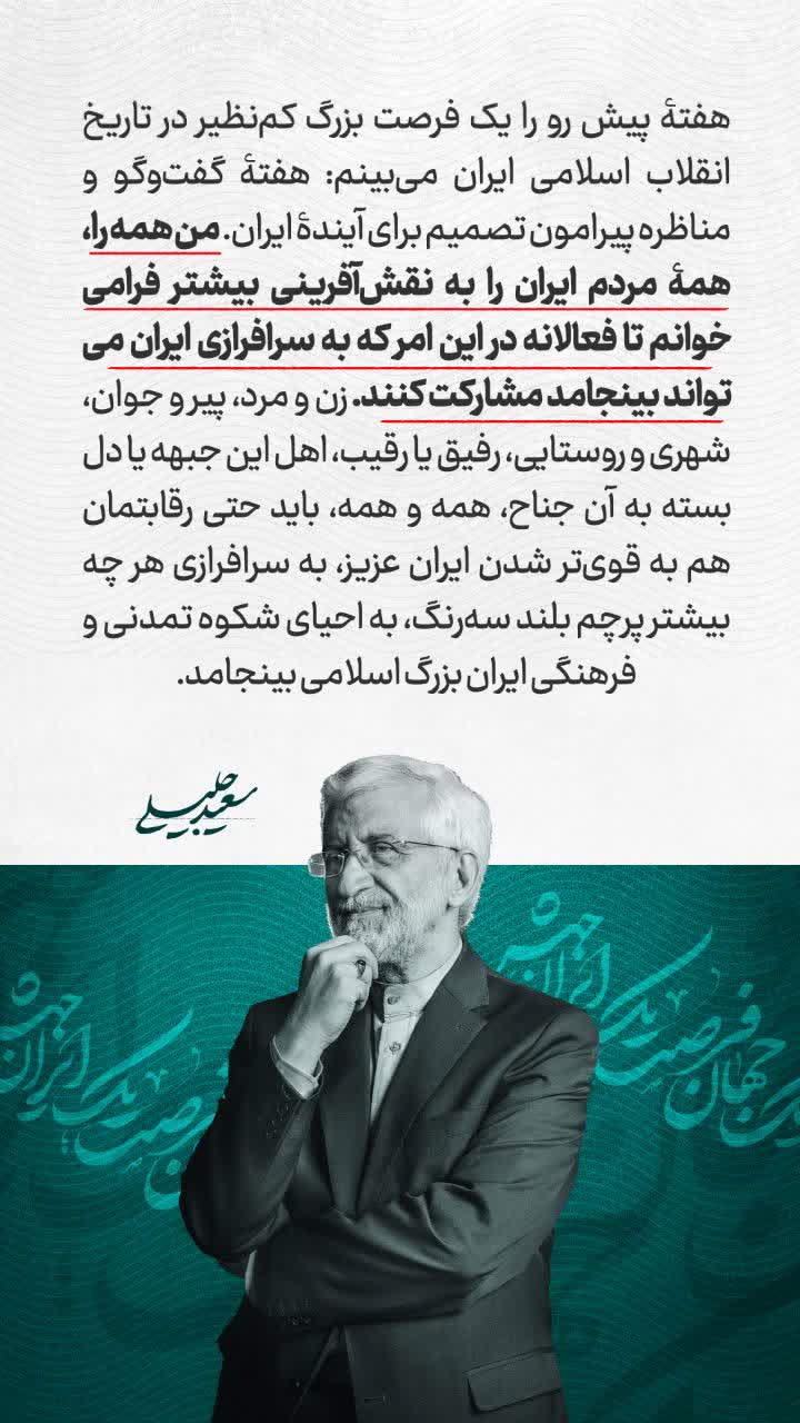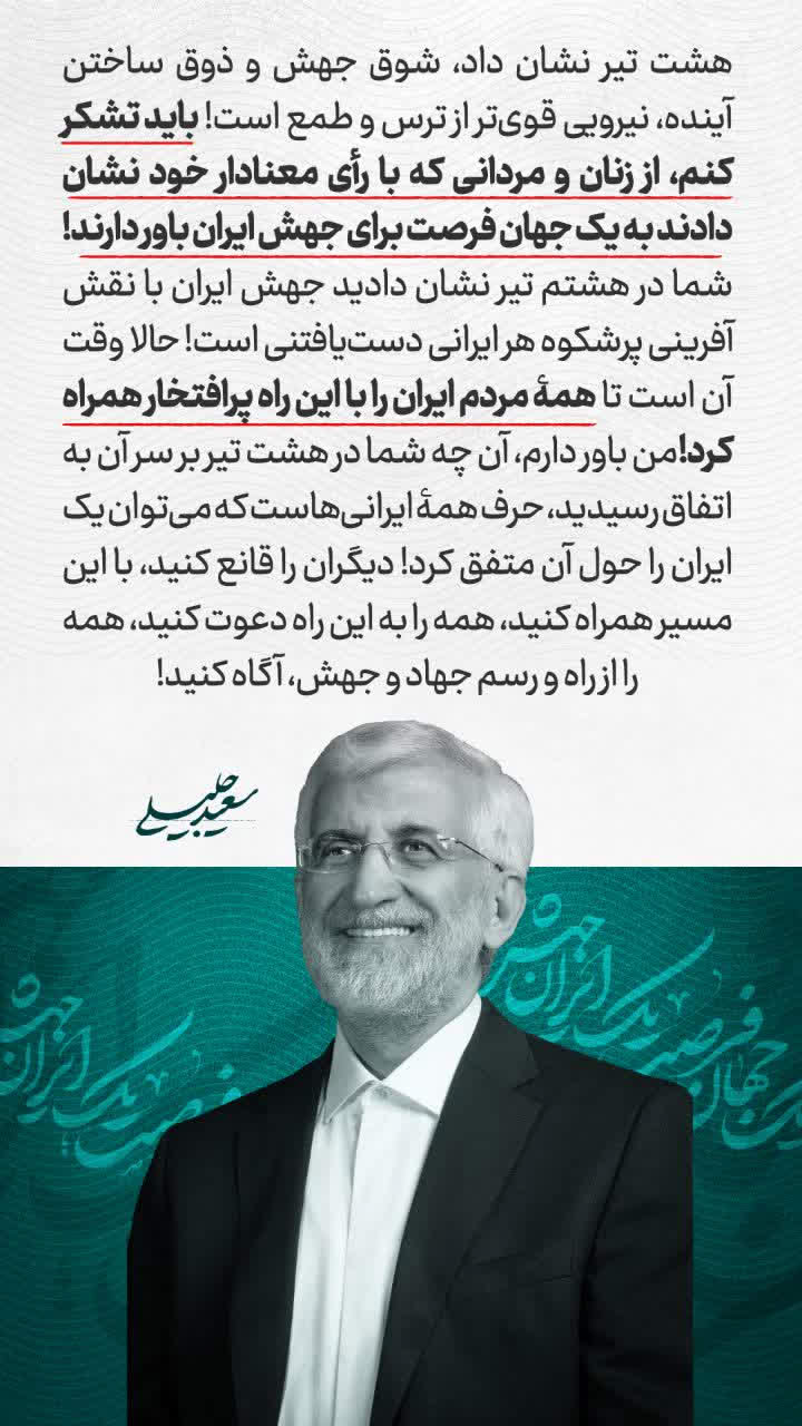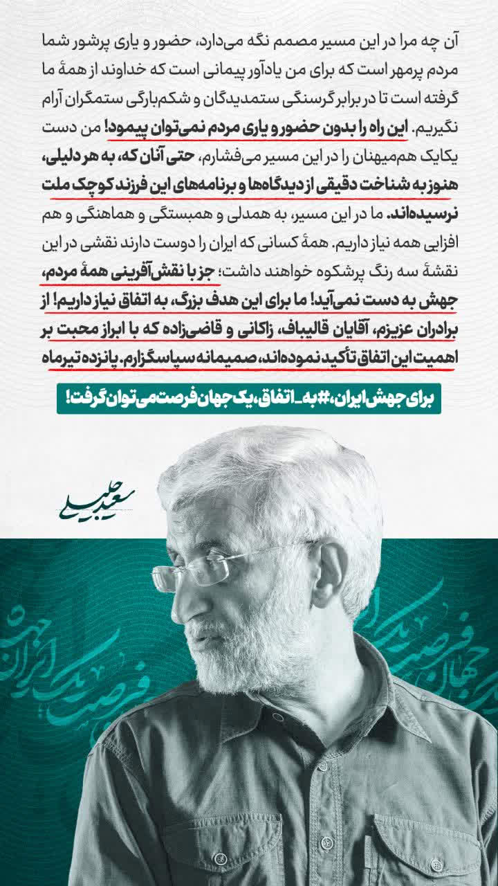 ما در این مسیر، به همدلی و همبستگی و هماهنگی و همافزایی همه نیاز داریم. همۀ کسانی که ایران را دوست دارند نقشی در این نقشۀ سه رنگ پرشکوه خواهند داشت؛ جز با نقشآفرینی همۀ مردم، جهش به دست نمیآید! ما برای این هدف بزرگ، به اتفاق نیاز داریم! از برادران عزیزم، آقایان قالیباف، زاکانی و قاضیزاده که با ابراز محبت بر اهمیت این اتفاق تأکید نمودهاند، صمیمانه سپاسگزارم. پانزده تیرماه برای جهش ایران، #به_اتفاق، یک جهان فرصت میتوان گرفت!
