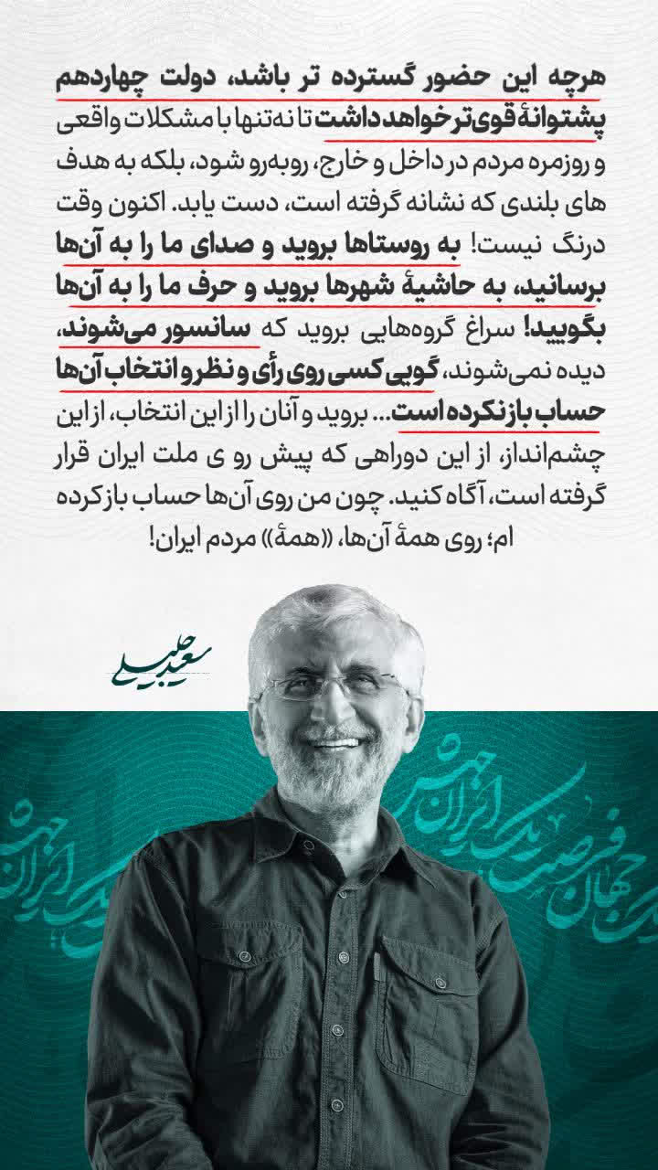 اکنون وقت درنگ نیست! به روستاها بروید و صدای ما را به آنها برسانید، به حاشیۀ شهرها بروید و حرف ما را به آنها بگویید! سراغ گروههایی بروید که سانسور میشوند، دیده نمیشوند، گویی کسی روی رأی و نظر و انتخاب آنها حساب باز نکرده است… بروید و آنان را از این انتخاب، از این چشمانداز، از این دوراهی که پیش رو ی ملت ایران قرار گرفته است، آگاه کنید. چون من روی آنها حساب باز کردهام؛ روی همۀ آنها، «همۀ» مردم ایران!