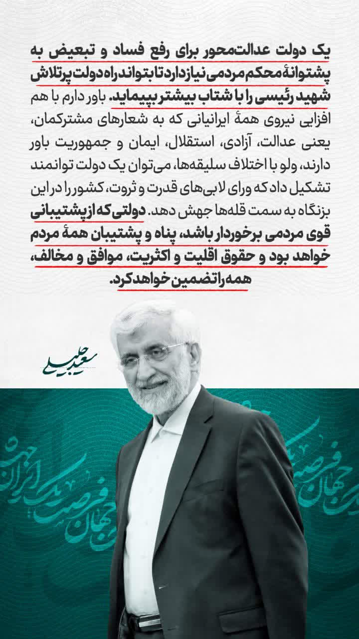 باور دارم با همافزایی نیروی همۀ ایرانیانی که به شعارهای مشترکمان، یعنی عدالت، آزادی، استقلال، ایمان و جمهوریت باور دارند، ولو با اختلاف سلیقهها، میتوان یک دولت توانمند تشکیل داد که ورای لابیهای قدرت و ثروت، کشور را در این بزنگاه به سمت قلهها جهش دهد. دولتی که از پشتیبانی قوی مردمی برخوردار باشد، پناه و پشتیبان همۀ مردم خواهد بود و حقوق اقلیت و اکثریت، موافق و مخالف، همه را تضمین خواهد کرد.
