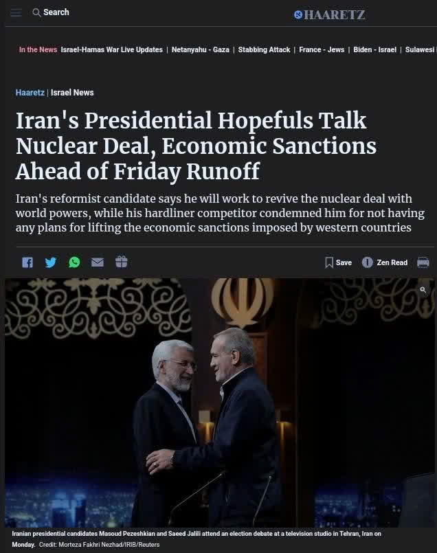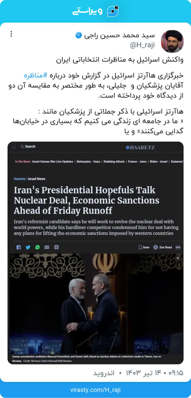 خبرگزاری هاآرتز اسرائیل در گزارش خود درباره #مناظره آقایان پزشکیان و جلیلی، به طور مختصر به مقایسه آن دو از دیدگاه خود پرداخته است.