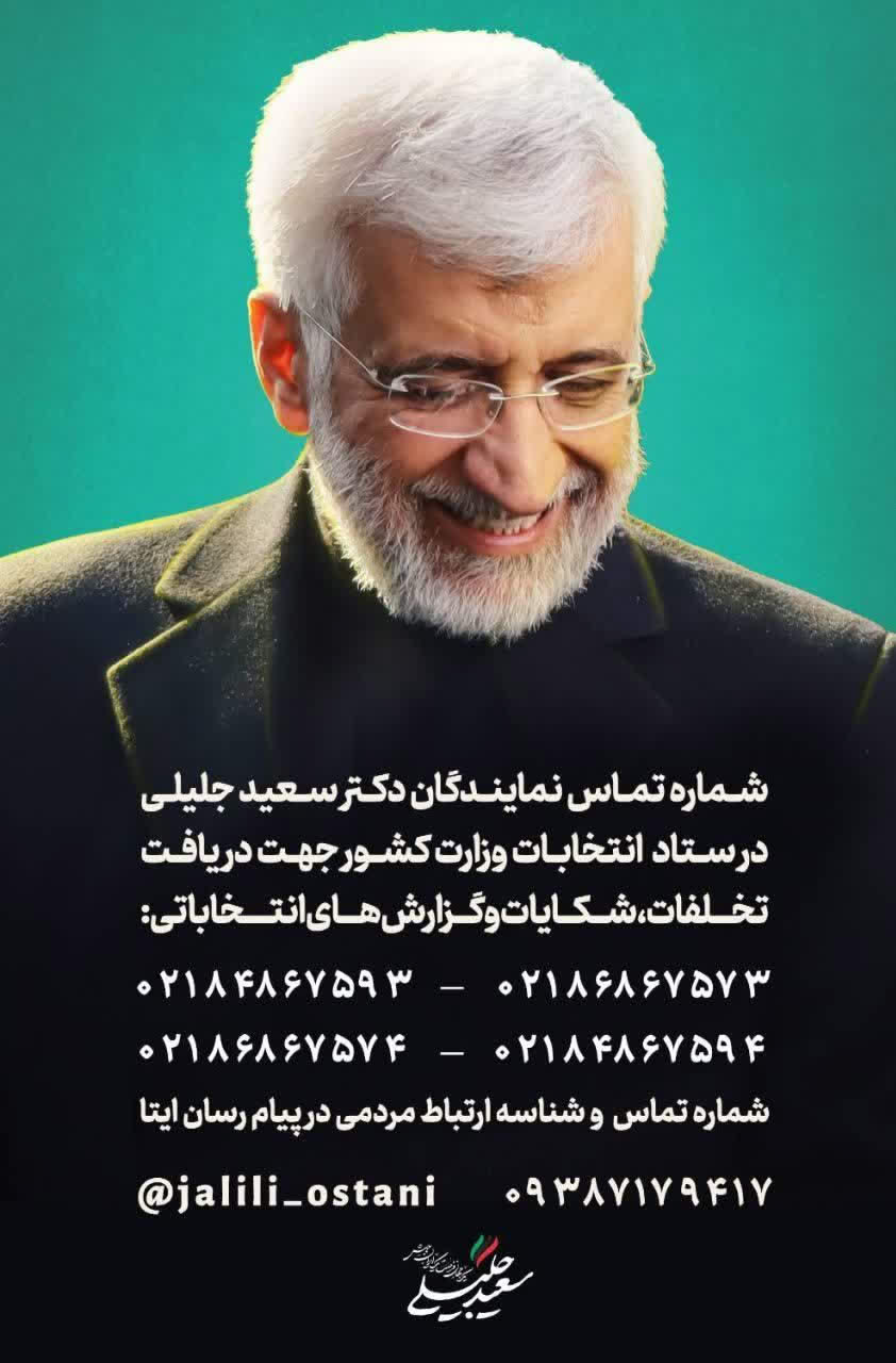 🔹شماره تماس نمایندگان دکتر سعید جلیلی در ستاد انتخابات وزارت کشور جهت دریافت تخلفات، شکایات و گـزارشهای انتخاباتی: