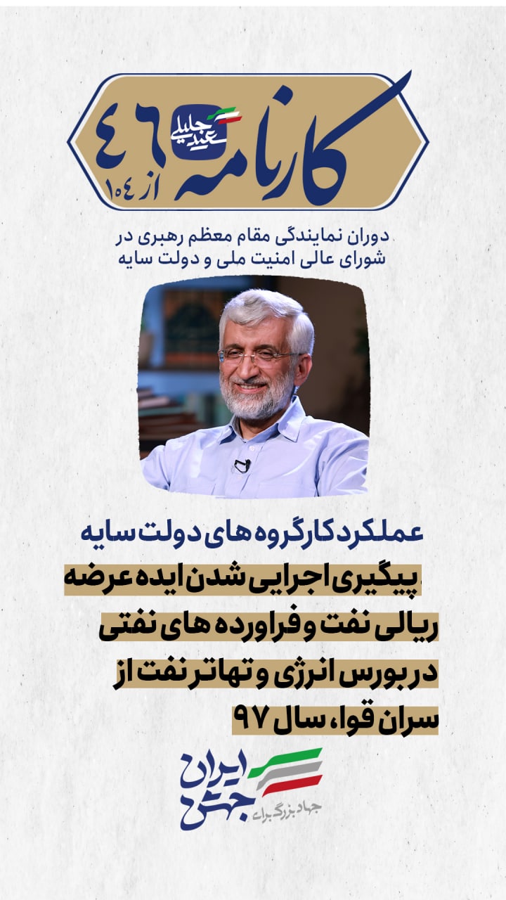 🔸تلاش جلیلی برای احیای فروش نفت ایران یکی از نمونه‌های تعامل وی با رقبا برای حل مشکلات مردم است. پس از خروج آمریکا از برجام و اعمال شدیدترین تحریم‌های نفتی علیه ایران، فروش نفت در دولت روحانی به روزی ۳۰۰ هزار بشکه رسید. در همان زمان، جلیلی در نامه‌ای به مسئولین دولتی، راهکارهای خود برای احیای فروش نفت و دور زدن تحریم‌های نفتی را اعلام کرد اما متاسفانه مورد توجه قرار نگرفت. در ابتدای دولت رئیسی، جلیلی در جلسه‌ای با وزیر پیشنهادی نفت، مجدداً راهکارهای خود را در اختیار دولت جدید قرار داد. با اجرایی شدن آن راهکارها، فروش نفت ایران آنقدر بیشتر شد که بنابر گزارش فایننشال‌تایمز، به بیشترین حد خود در شش سال گذشته رسیده است. طبق آخرین گزارش‌ها، ایران روزانه یک میلیون و ۵۰۰ هزار بشکه صادر می‌کند.