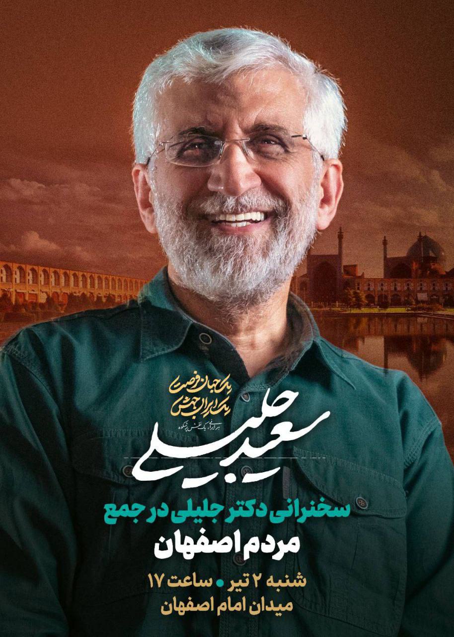 ستاد دکتر سعید جمهور اعلام کرده است بزرگترین اجتماع مردمی و انتخاباتی کشور در میدان امام اصفهان با حضور دکتر سعید جلیلی ساعت ۱۷ روز ۲ تیر برگزار خواهد شد… از عموم مردم و یاران سعید جلیلی و البته کسانی که هنوز مردد هستند و نامزد مورد نظرشان را انتخاب نکرده اند دعوت میشود برای شنیدن سخنرانی دکتر جلیلی در این همایش حضور پیدا کنید…